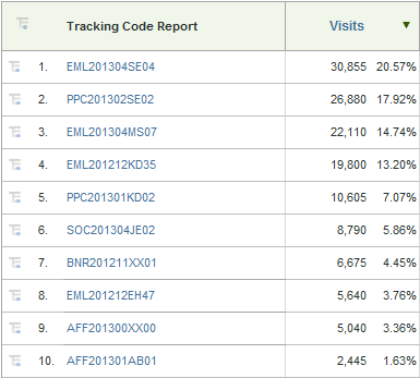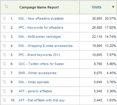 Your friendly marketer was planning ahead and kept to a strict schema when assigning new campaign IDs, which makes it easy to just add up the numbers. As an example, all those tracking codes starting with “EML” are definitely email campaigns.