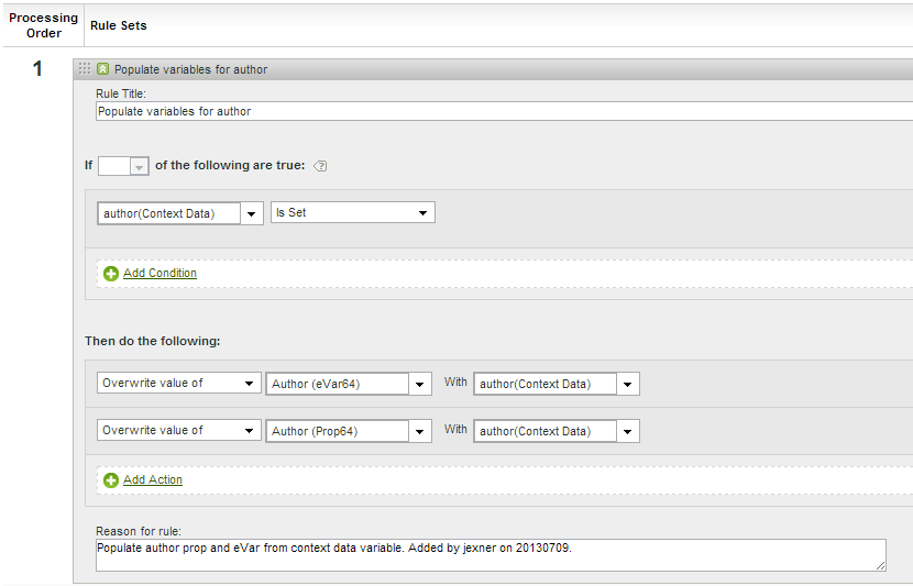 On pages where the developer — you — has set an author, the Processing Rule will populate both eVar64 and prop64.