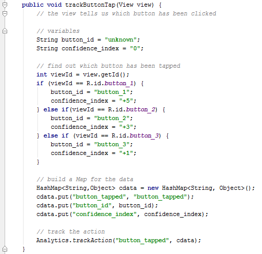 You will have to add similar tracking code to any parts of the app that are considered important. That includes buttons but also activities. On some of them you might want to share more than just the lifecycle metrics! Use a cdata HashMap and pass it along where needed. Your friendly marketer and Processing Rules will do the rest.
