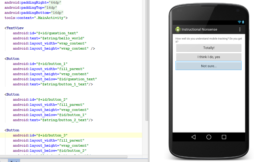 In order to demonstrate all three of the above, I will add three buttons to my nonsensical app. I will display a question above those and the user can then tap one of the buttons as an answer.