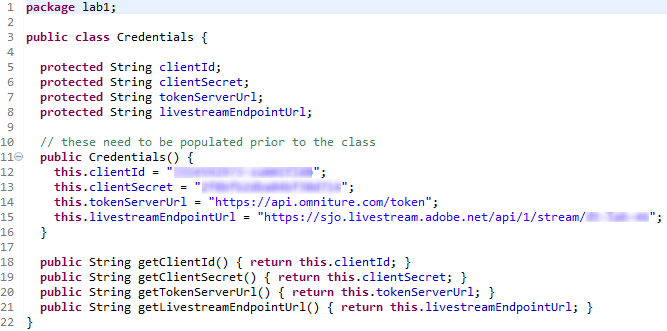 You probably noticed that the code references an instance of the Credentials class. That class holds client ID, client secret and those two URLs we need.
