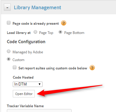 My naive approach, based on the assumption that “hey, this is DTM, everything is done somewhere in the UI!”, was to use the editor under “Customize Page Code” in the configuration of the Adobe Analytics Tool.
