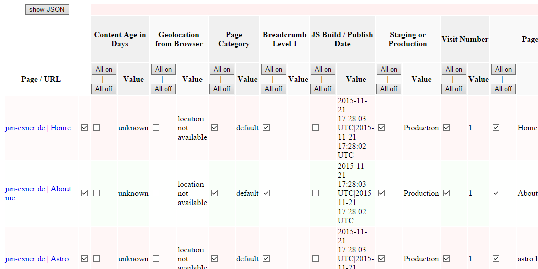 The “All on” & “All off” buttons at the top do exactly what you’d expect: they switch testing for the Data Element on or off for all pages.