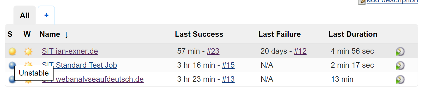 The yellow circle in the first column, first row says that the status for the first job is “unstable”, meaning there have been failures recently. The blue circles in rows 2 & 3 say “all good here!”