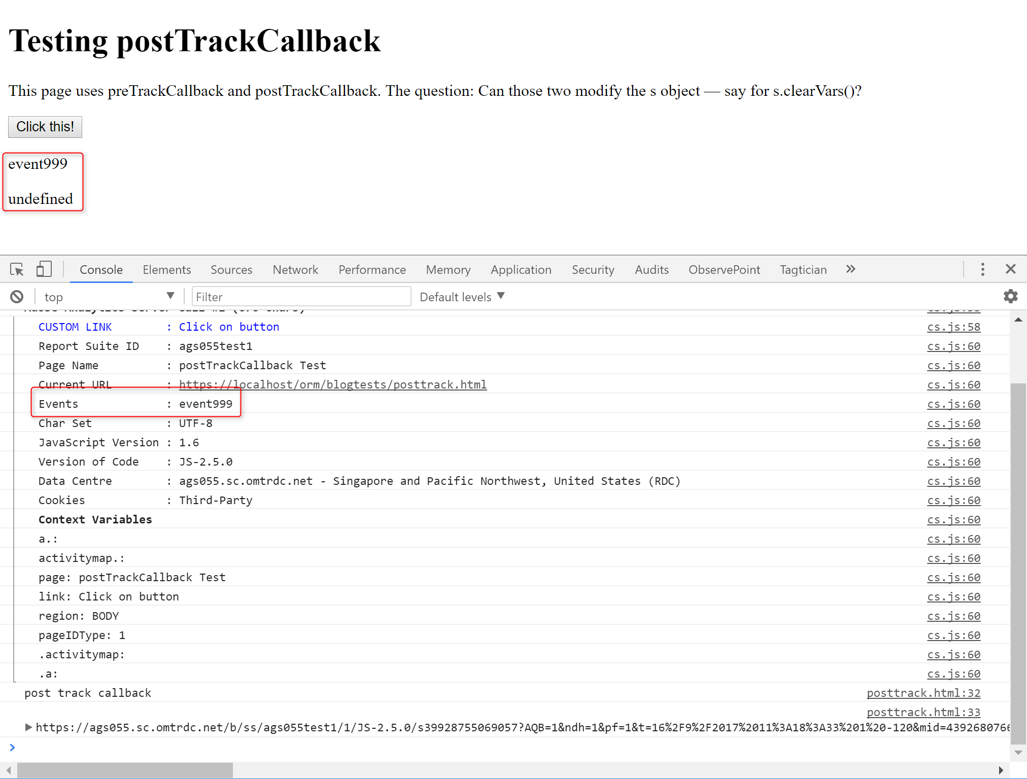 Pre- and postTrack callbacks output the tracking request URL, plus they print the value of the s.events “variable” into the page. The postTrack callback also calls s.clearVars(), a function that cleans the s object and that is often uses with click tracking or in SPAs.