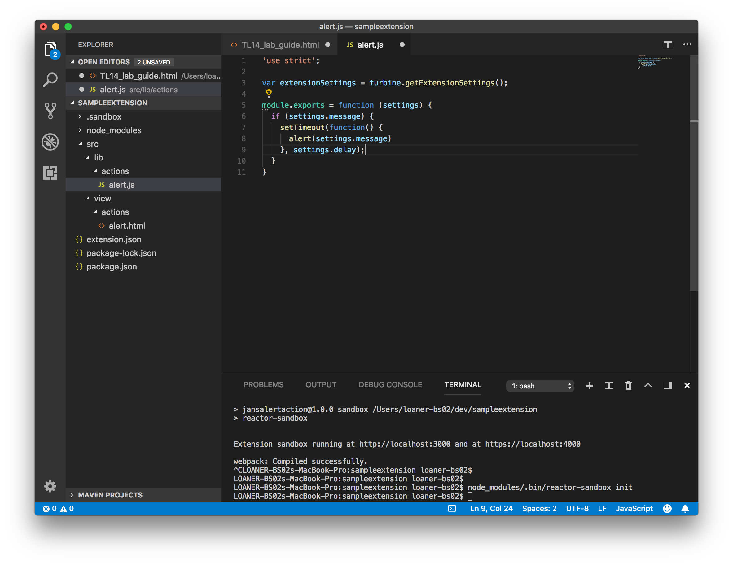 The “alert.js” file contains the code that Launch will deliver into the site. This code has to actually make our Action happen.