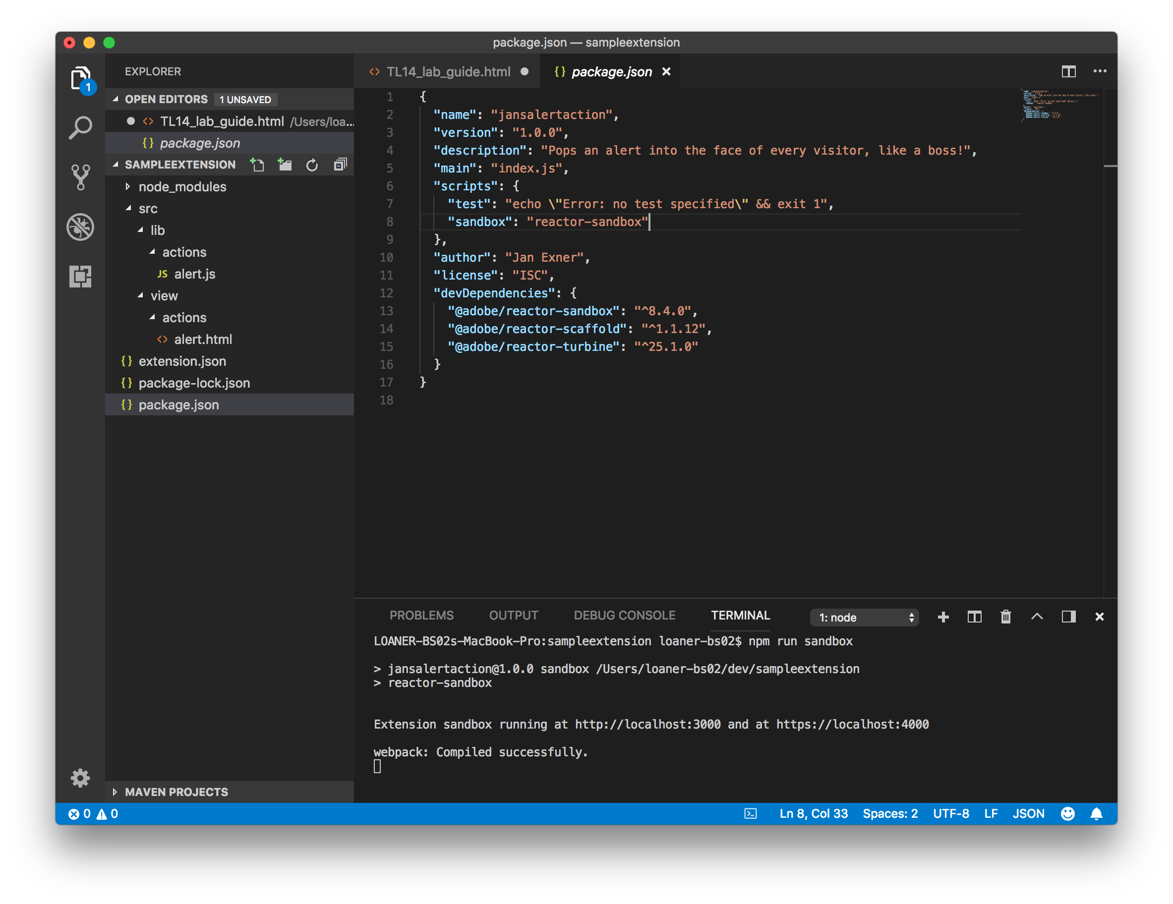 18. Type npm install @adobe/reactor-turbine @adobe/reactor-sandbox --save-dev into your command line
