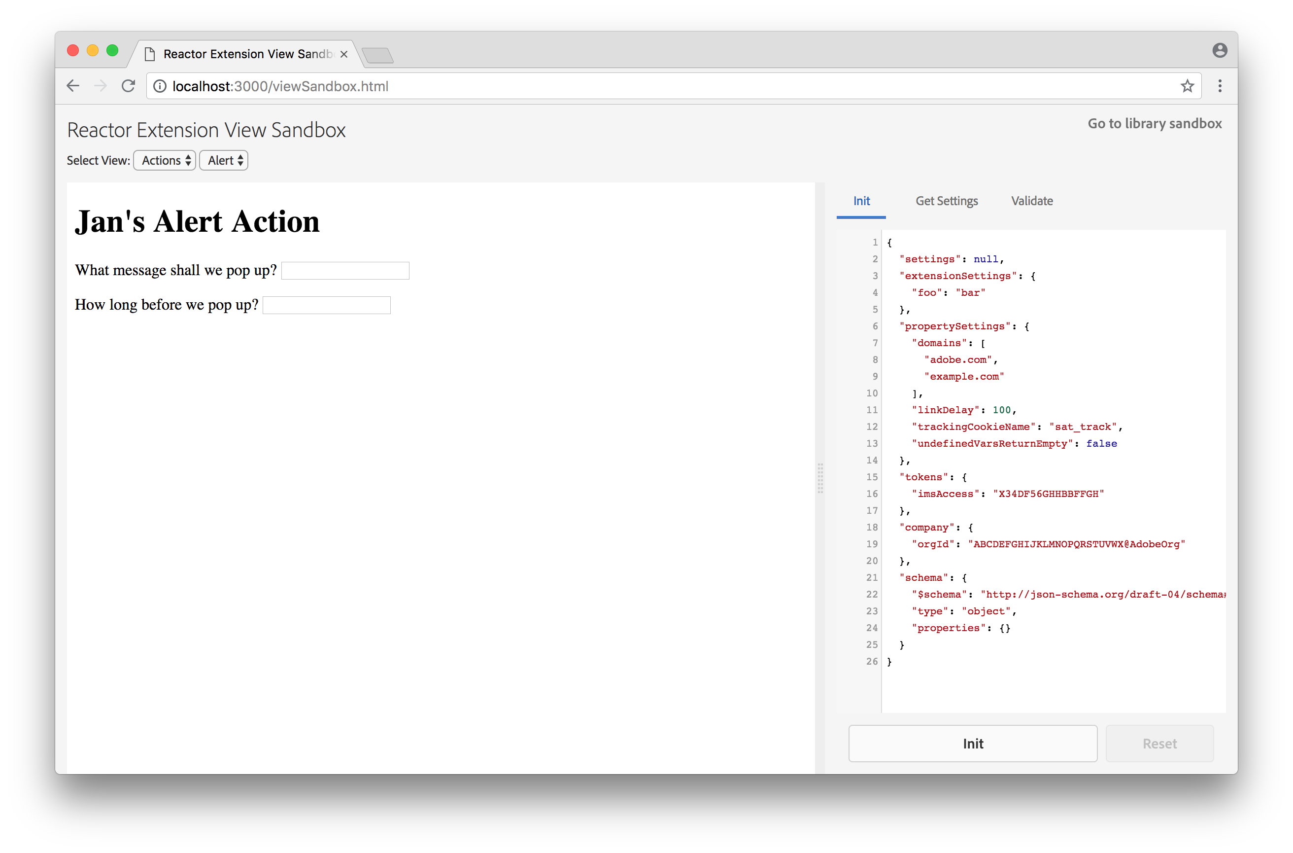 This “container.js” file simulates a Launch Property. It contains one Rule, triggered at Page Top (or Library Load), and one Action (our Action). You can now in the Sandbox click over to the Library Sandbox, and you should see an alert after 10 seconds.
