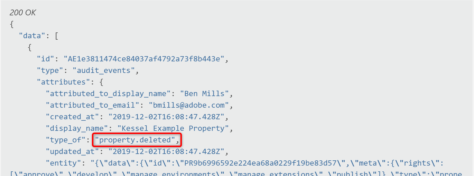 The screenshot in the documentation shows an Audit Event of my colleague Ben Mills deleting a property:
