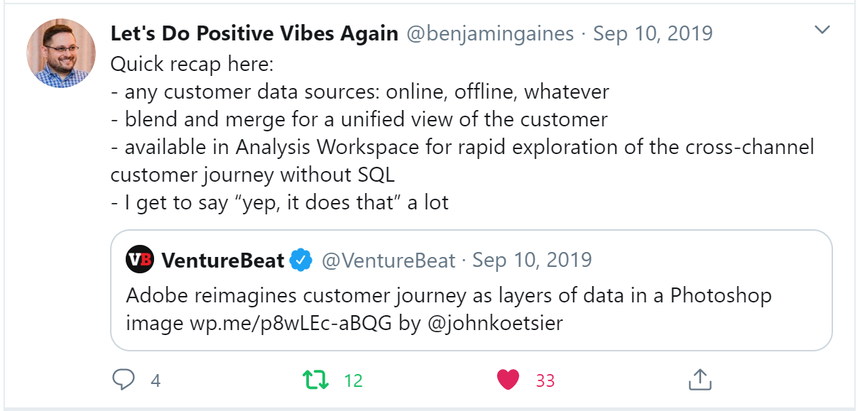 First our product management announced some changes for Workspace “Customer Journey Analytics“, then Aaron Hardy, Joe Khoury, Justin Grover, and Jenny Medeiros posted an announcement about a unified Javascript library.