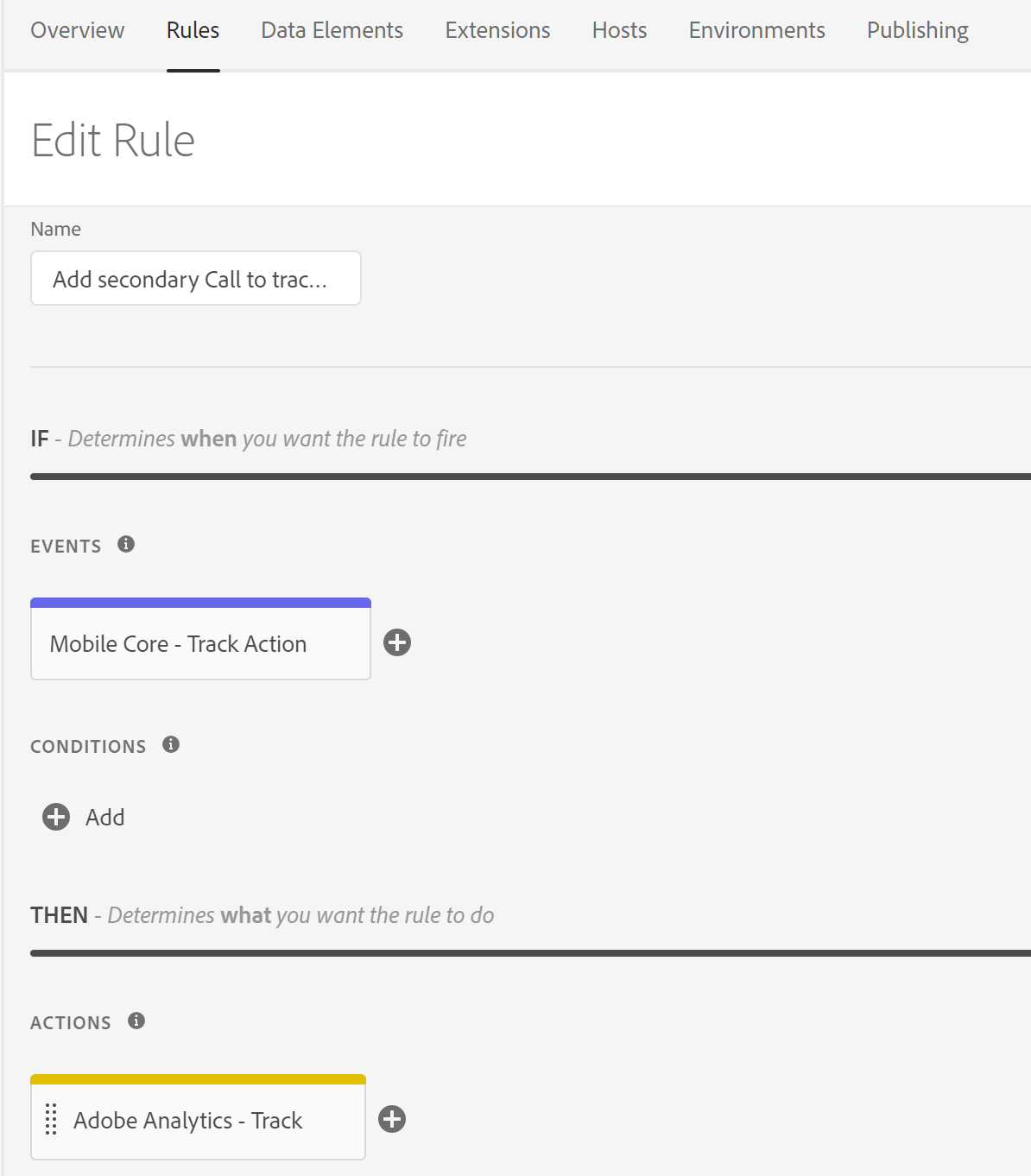 So, let’s build one that uses “Mobile Core – Track Action” as the Event Type, and “Analytics – Track” as the Action Type. This will result in an additional server call, and you wouldn’t want to do this in any real life scenario.