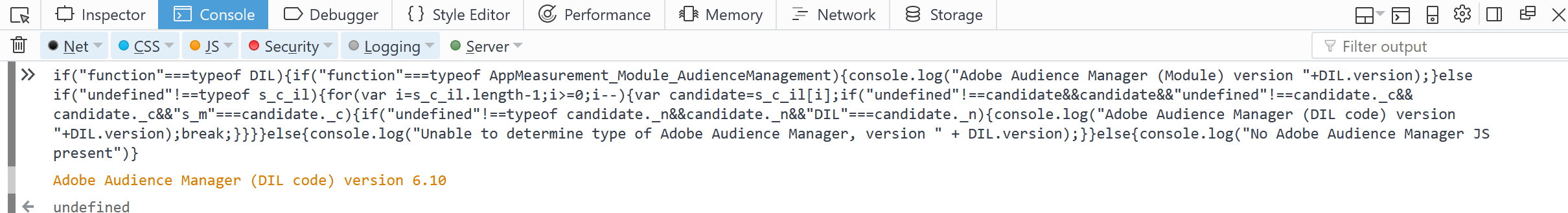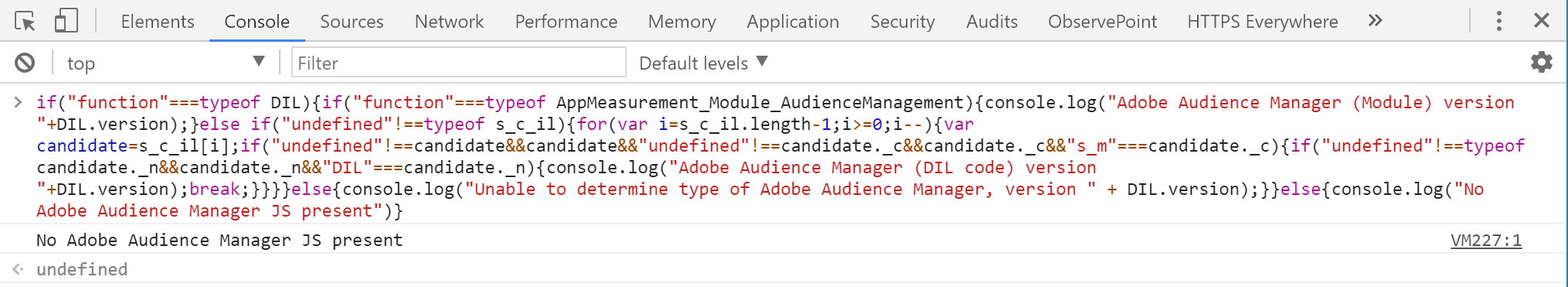 if("function"===typeof DIL){if("function"===typeof AppMeasurement_Module_AudienceManagement){console.log("Adobe Audience Manager (Module) version "+DIL.version);}else if("undefined"!==typeof s_c_il){for(var i=s_c_il.length-1;i>=0;i--){var candidate=s_c_il[i];if("undefined"!==candidate&&candidate&&"undefined"!==candidate._c&&candidate._c&&"s_m"===candidate._c){if("undefined"!==typeof candidate._n&&candidate._n&&"DIL"===candidate._n){console.log("Adobe Audience Manager (DIL code) version "+DIL.version);break;}}}}else{console.log("Unable to determine type of Adobe Audience Manager, version " + DIL.version);}}else{console.log("No Adobe Audience Manager JS present")}