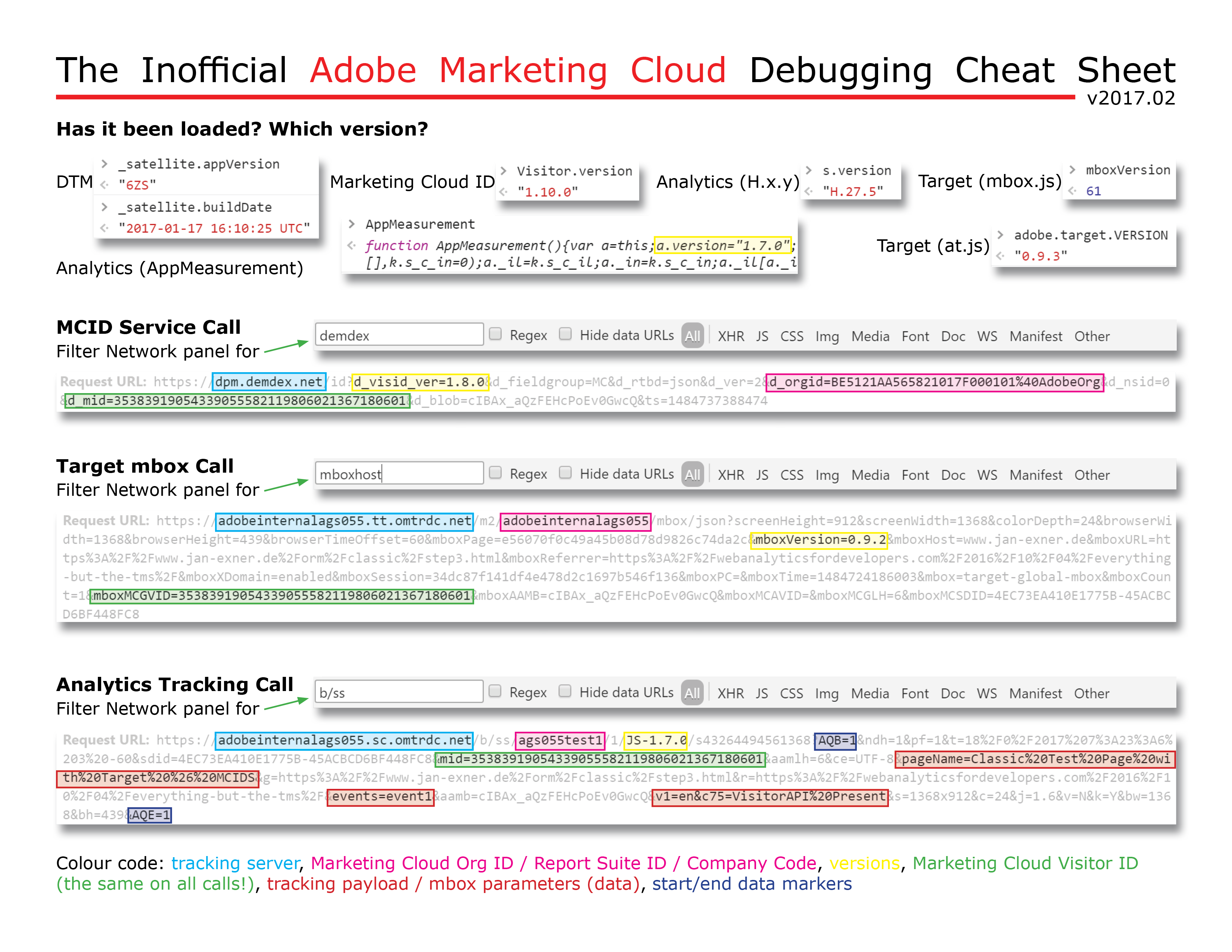 I also made the Inofficial Adobe Marketing Cloud Debugging Cheat Sheet (PDF letter version), also available as an A4 version, which you can put up onto your wall: