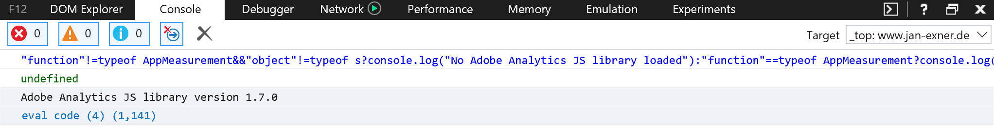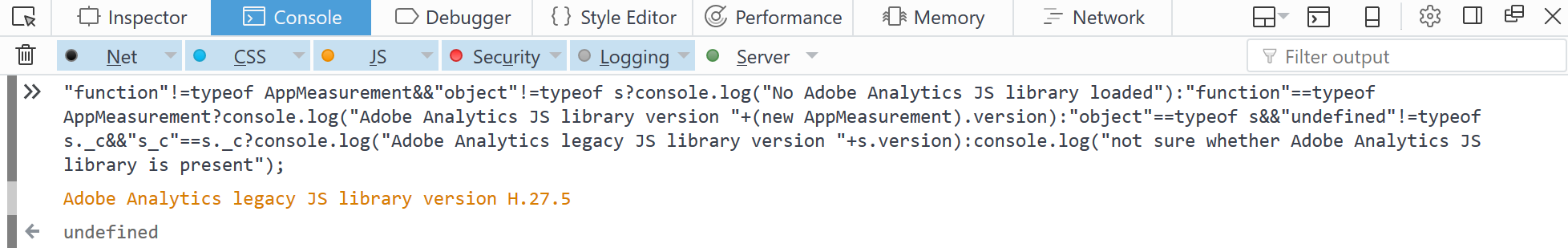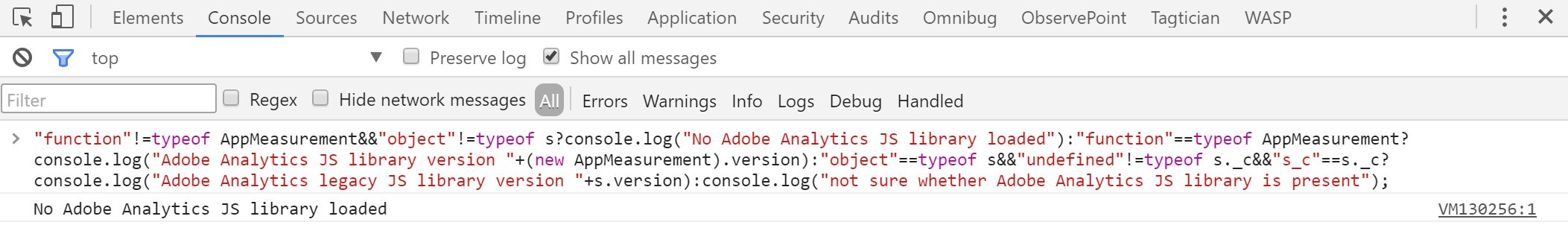 "function"!=typeof AppMeasurement&&"object"!=typeof s?console.log("No Adobe Analytics JS library loaded"):"function"==typeof AppMeasurement?console.log("Adobe Analytics JS library version "+(new AppMeasurement).version):"object"==typeof s&&"undefined"!=typeof s._c&&"s_c"==s._c?console.log("Adobe Analytics legacy JS library version "+s.version):console.log("not sure whether Adobe Analytics JS library is present");