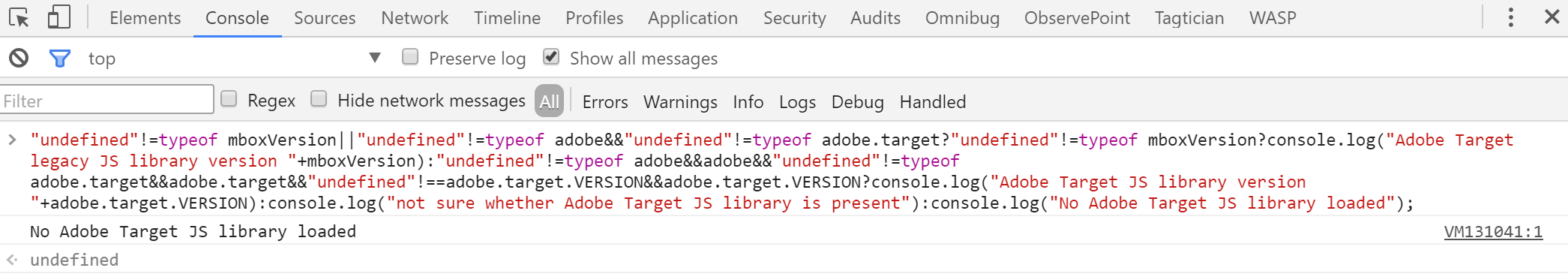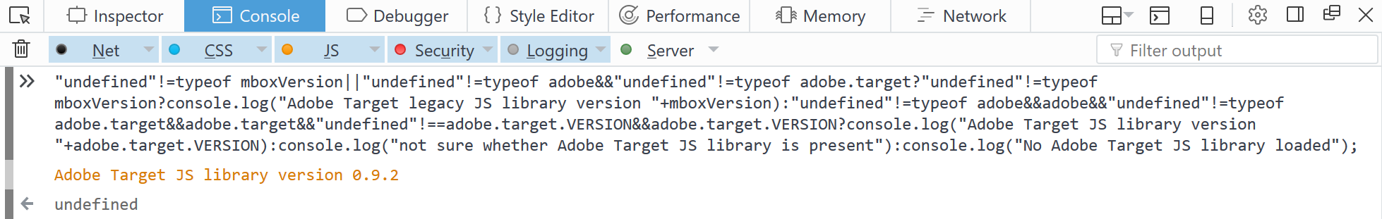 Find out whether the Target library is being loaded, which type you are using (mbox.js or at.js), and which version: