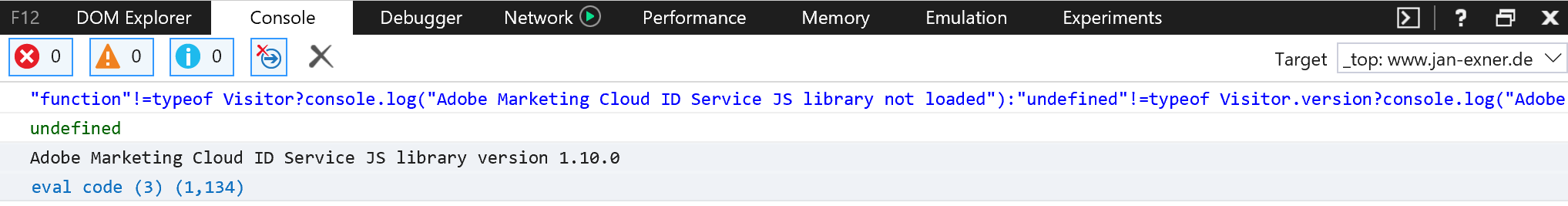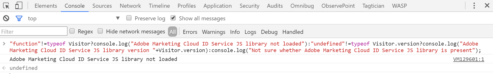 Note: this works for Marketing Cloud ID Service version 2 and up. Before that, the “version”property was not exposed like this. If your page uses a “visitor” variable, the snippet will work, too.